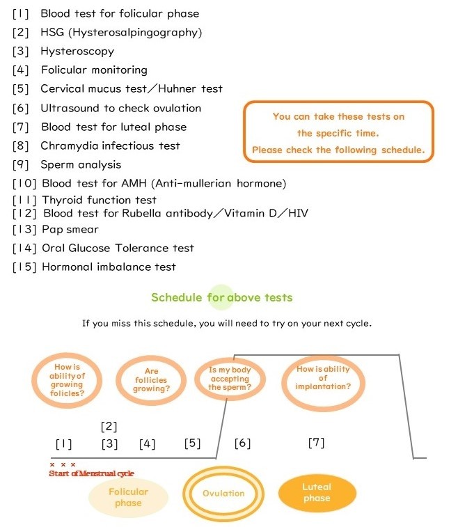 Pregnancy is established through various processes until the egg grows, fuses with the sperm, and attaches to the uterus. If you are aiming for a natural pregnancy, the following tests are performed. The timing of these tests is determined by the woman's menstrual cycle.