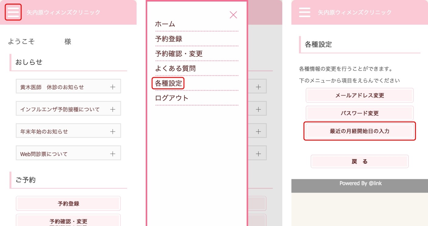 予約システムにログイン→左側上のメニューマーク→メニュー内の“各種設定”→“最近の月経開始日の入力”