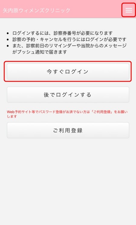 初めにご利用登録を行い、その後に初診のご予約を行ってください。*婦人科受診希望の方はお電話でご予約下さい。